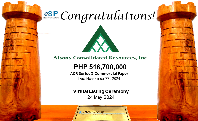 24 May 2024, Makati, Philippines — Alsons Consolidated Resources, Inc. (ACR) returns to the local debt market for the listing of its Series Z Due November 22, 2024, Commercial Papers amounting to a total of PHP 516,700,000.