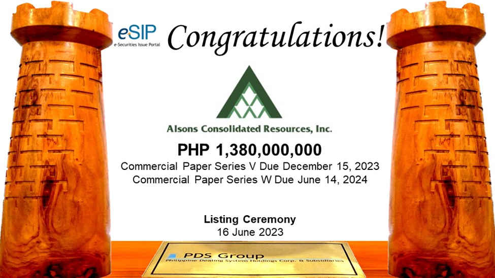 16 June 2023, Makati, Philippines — Alsons Consolidated Resources, Inc. (ACR) returns to the local debt market to list its PHP 1.38 Billion Commercial Paper. The ACR Series V and Series W Commercial Paper were pegged at discount rates of 7.3593% and 7.9242%, respectively.