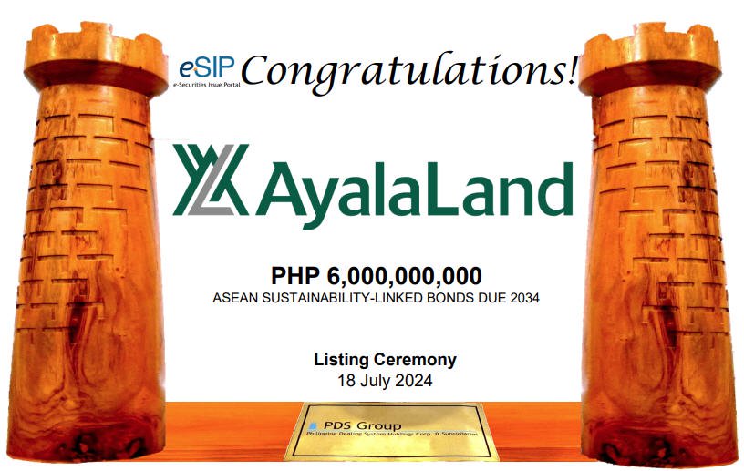 18 July 2024, Makati, Philippines — Ayala Land, Inc. (ALI) returns to the capital debt market for the pioneer listing of ASEAN Sustainability-Linked Bonds Due 2034 with a total amount of PHP 6 billion.