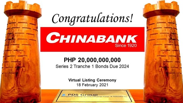 18 February 2021, Makati, Philippines — China Banking Corporation (CHIB) returns to the local debt market today with the listing of its PHP 20 Billion 3-year Series 2 Tranche 1 Bonds at 2.50% per annum, to be paid monthly.