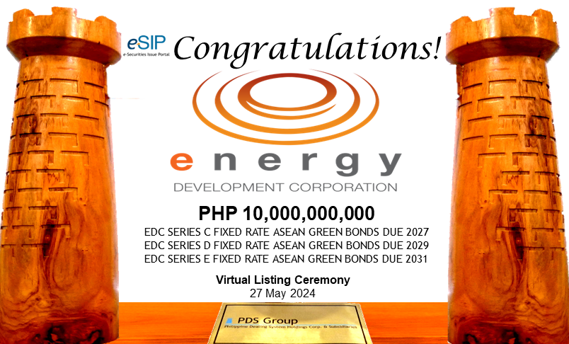 27 May 2024, Makati, Philippines — Energy Development Corporation returns to the local debt market for the listing of its PHP 10 billion Fixed Rate ASEAN Green Bonds, the second tranche of its PHP 15 billion ASEAN Green Bonds shelf registration in the Philippine Dealing & Exchange Corp. (PDEx). The second tranche bonds were priced at the lowest end of the credit spread range, with rates of 6.7478%, 6.8873% and 7.0626% for the 3-year, 5-year and 7-year series, respectively.