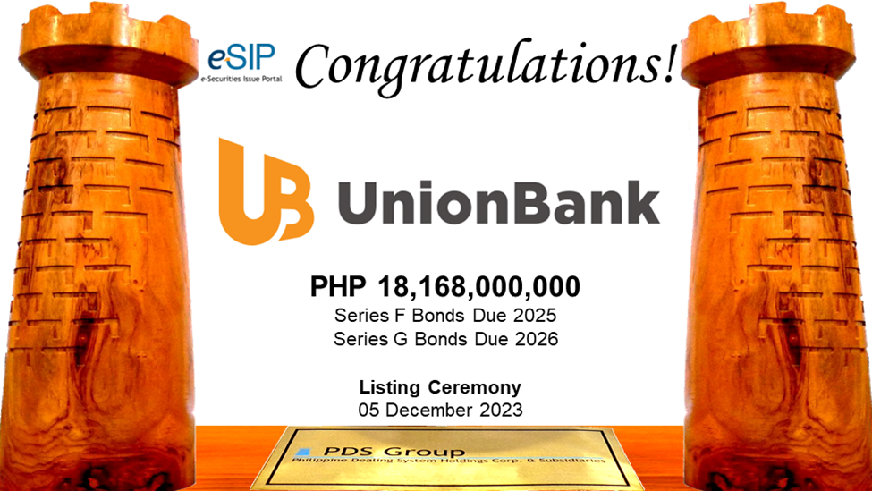 05 December 2023, Makati, Philippines — Union Bank of the Philippines lists its PHP 18.168 Billion 1.5 and 3-Year Fixed Rate Bonds on the Philippine Dealing & Exchange Corp. The bonds carry coupon rate of 6.5625% p.a. and 6.6800% p.a., respectively, to be paid quarterly. The bonds received strong demand from investors, allowing the bank to upsize the issuance to over nine times the initial minimum offer size of P2 billion for both tranches.