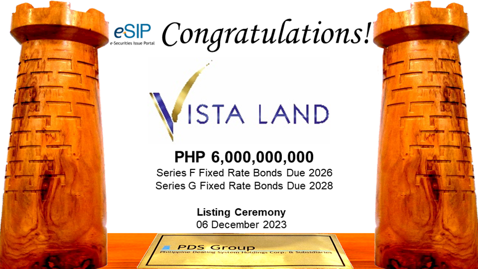 06 December 2023, Makati, Philippines — Vista Land and Lifescapes, Inc. (VLL) lists its PHP 6 Billion Series F and Series G Bonds on the Philippine Dealing & Exchange Corp. (PDEx). The bonds have coupon rates of 7.5426% p.a., and 7.6886% p.a., to be paid on a quarterly basis.